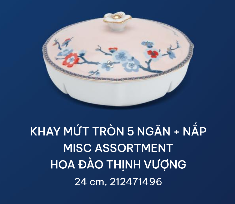 Khay mứt nổi bật với kiểu dáng sang trọng, hoa văn tinh tế, thiết kế gồm 5 ngăn tiện lợi, có nắp sứ đậy kín, sử dụng để đựng và bảo quản các loại bánh mứt, các loại hạt sấy khô…