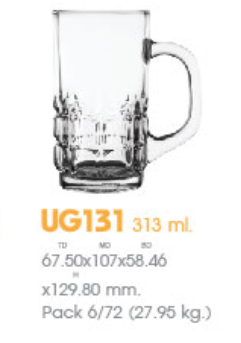 | UG 131 | Ø: 10.7cm - ØĐáy: 5.8cm - 325ml - Cao: 12.9cm - 6 lố/Thùng - 6 c/Hộp - 27Gr. |
