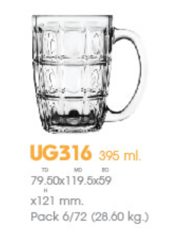 | UG 316 | Ø: 11.9cm - ØĐáy: 5.9cm - 410ml - Cao: 12.1cm - 6 lố/Thùng - 6 c/Hộp - 27Gr. |