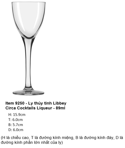 | LIB 9250 | ØĐáy: 5.7cm - ØMiệng: 6cm - 89ml - Cao: 15.9cm - 24Cái/Thùng |