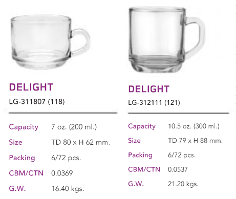 | LG 312111 121 | Ø: 7.9cm - 300ml - Cao: 8.8cm - 72 Cái/Thùng - 6 Cái/Hộp - 21Gr. |