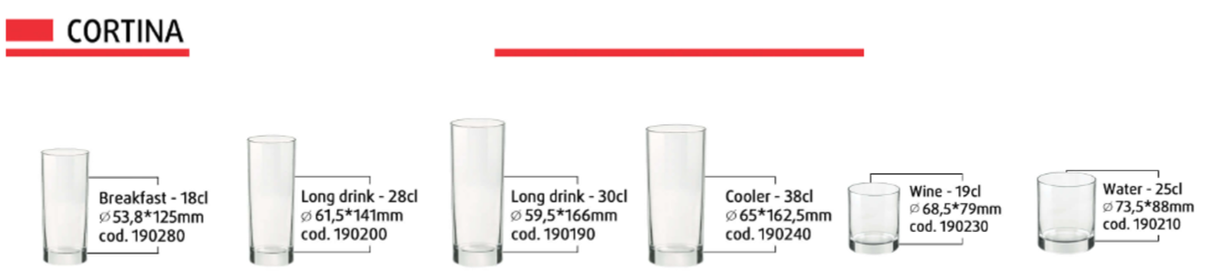 Dòng sản phẩm Cortina của thương hiệu Bormioli Rocco được làm từ chất liệu thủy tinh cao cấp. Với dây chuyền sản xuất hiện đại và công nghệ truyền thống mang lại vẻ đẹp lung linh cực kỳ tinh tế khi trang trí trên trên bàn tiệc.