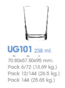 | UG 101 | Ø: 7cm - ØĐáy: 5.7cm - 230ml - Cao: 9.5cm - 6 lố/Thùng - 6 c/Hộp - 13Gr. |