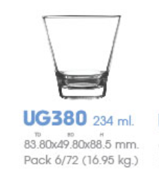 | UG 380 | Ø: 8.3cm - ØĐáy: 4.9cm - 235ml - Cao: 8.8cm - 6 lố/Thùng - 6 c/Hộp - 16Gr. |
