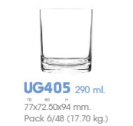 | UG 405 | Ø: 7.7cm - ØĐáy: 7.2cm - 290ml - Cao: 9.4cm - 4 lố/Thùng - 6 c/Hộp - 17Gr. |