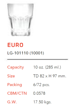 | LG 101110 10001 | Ø: 8.2cm - 285ml - Cao: 9.7cm - 72 Cái/Thùng - 6 Cái/Hộp - 18Gr. |