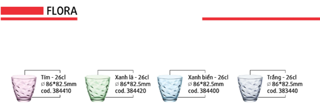 Ly thủy tinh Flora được làm từ chất liệu thủy tinh cao cấp, đạt chất lượng Châu Âu về độ sáng bóng, không bị phai màu hoặc giảm độ trong suốt theo thời gian, an toàn cho người sử dụng đồng thời chống bám bẩn tốt và dễ chùi rửa nên giúp tiết kiệm công sức cho người nội trợ.