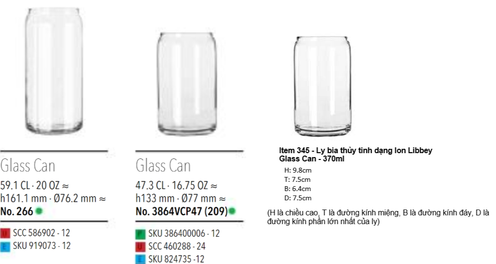 | LIB 345 | ØĐáy: 7.5cm - ØMiệng: 6.4cm - 370ml - Cao: 12cm - 12Cái/Thùng |