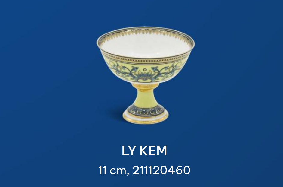 Bộ trà Hoàng Cung Hoàng Liên có hình ảnh chủ đạo từ hoa sen cách điệu phối với các đường nét hoàng cung trên nền men vàng quý tộc.