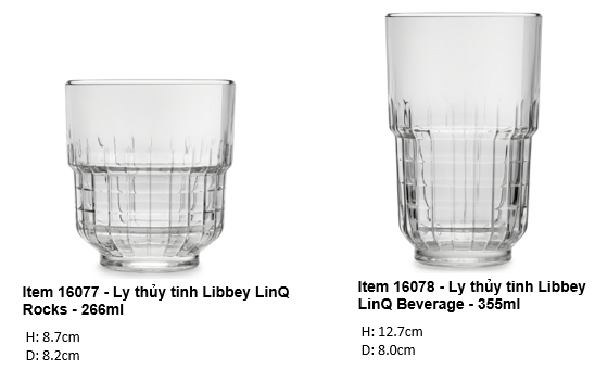 - Không khó khăn để nhận biết độ lớn của Libbey thông qua sự đa dạng về mẫu mã, về dung tích trong cùng một thiết kế. Libbey còn được biết đến về độ bền nổi trội, đóng góp đáng kể về mặt hiệu quả kinh tế cho các khách hàng khu vực khách sạn, nhà hàng, quán cafe.