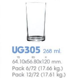 | UG 305 | Ø: 6.4cm - ØĐáy: 5.6cm - 255ml - Cao: 12cm - 6 lố/Thùng - 6 c/Hộp - 17Gr. |