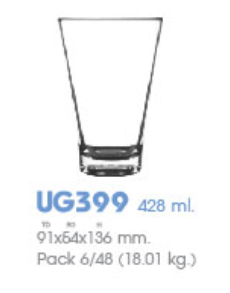 | UG 399 | Ø: 9.1cm - ØĐáy: 6.4cm - 428ml - Cao: 13.6cm - 4 lố/Thùng - 6 c/Hộp - 19Gr. |