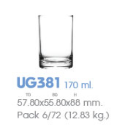 | UG 381 | Ø: 5.7cm - ØĐáy: 5.5cm - 170ml - Cao: 8.8cm - 6 lố/Thùng - 6 c/Hộp - 13Gr. |