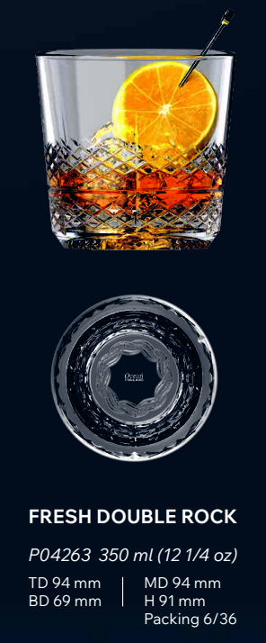 Ly Matter Fresh Double Rock 350ml Ø: 9.4cm Ø:Đáy: 6.9cm Ø:M 9.4cm 350ml Cao: 9.1cm 36 Cái/Thùng 6 Cái/Hộp Ocean Thủy Tinh OC 1P04263