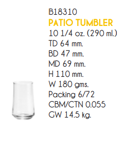 | OC 1B18310 | Ø: 6.9cm - ØĐáy: 4.7cm - ØMiệng: 6.4cm - 290ml - Cao: 11cm - 72 Cái/Thùng - 6 Cái/Hộp |