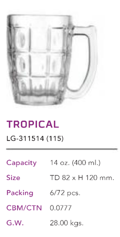 Ly Quai Mãng Cầu TROPICAL Ø: 8.2cm 400ml Cao: 12cm 72 Cái/Thùng 6 Cái/Hộp 28Gr. Lucky Glass Thủy Tinh TL Glass Cup LG 311514 115