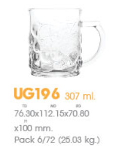 | UG 196 | Ø: 11.2cm - ØĐáy: 7cm - 310ml - Cao: 10cm - 6 lố/Thùng - 6 c/Hộp - 25Gr. |