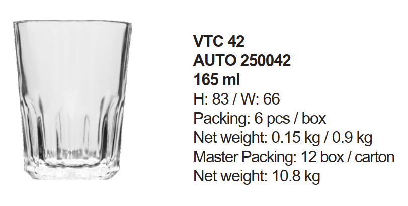 | VTC 42 | Ø: 6.6cm - 165ml - Cao: 8.3cm - 72 Cái/Thùng - 6 Cái/Hộp |