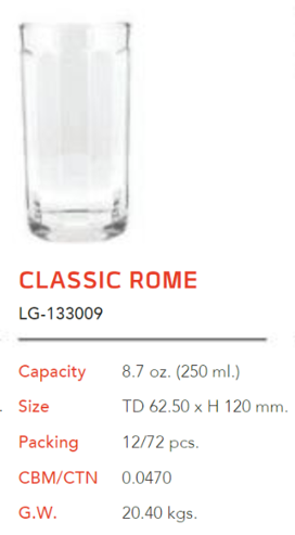 Ly Suông Trung Sọc CLASSIC ROME Ø: 6.2cm 250ml Cao: 12cm 72 Cái/Thùng 12 Cái/Hộp 20Gr. Lucky Glass Thủy Tinh TL Glass Cup LG 133009