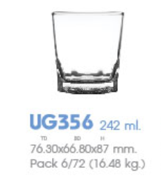| UG 356 | Ø: 7.6cm - ØĐáy: 6.6cm - 265ml - Cao: 8.7cm - 6 lố/Thùng - 6 c/Hộp - 16Gr. |