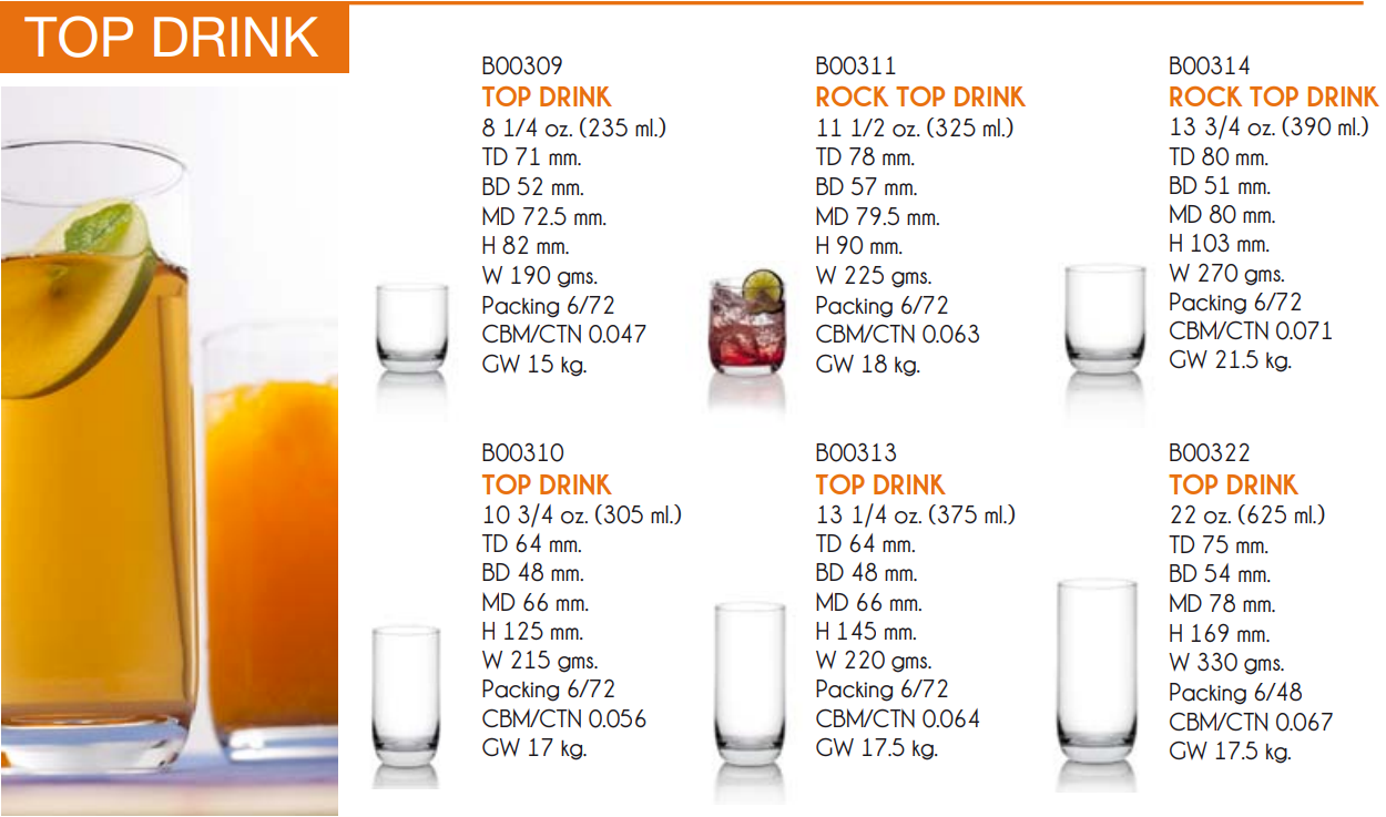 | OC 1B00310 | Ø: 6.5cm - ØĐáy: 4.8cm - ØMiệng: 6.4cm - 305ml - Cao: 12.5cm - 72 Cái/Thùng - 6 Cái/Hộp |