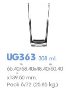 | UG 363 | Ø: 6.8cm - ØĐáy: 6cm - 310ml - Cao: 13.9cm - 6 lố/Thùng - 6 c/Hộp - 22Gr. |
