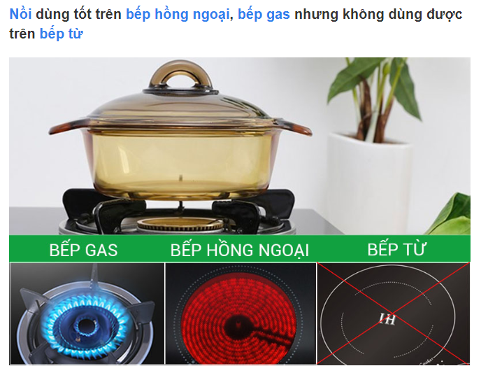 - Có thể sử dụng trên các loại bếp điện, hồng ngoại, bếp gas, cồn, lò vi sóng, lò nướng gia đình ( trừ bếp từ).