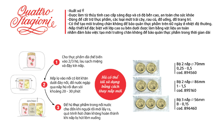 Ngoài công dụng như những chiếc hũ thủy tinh thông thường là dùng để cất trữ gia vị, các loại ngũ cốc, bánh kẹo, hoặc để trang trí...hũ thủy tinh Quattro Stagioni sản xuất tại Ý của thương hiệu Bormioli Rocco còn có tính năng vô cùng độc đáo: Bảo quản thực phẩm đã chế biến trên 60 ngày ở nhiệt độ thường. Cùng lướt qua những ưu điểm của hũ thủy tinh Quattro Stagion nhé