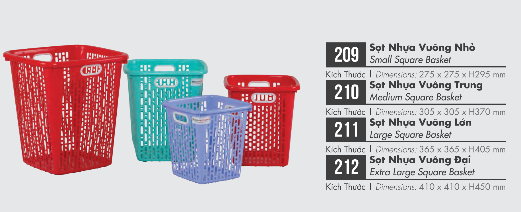 Sọt Nhựa Vuông Nhỏ (209): 275 x 275 x H295 mm