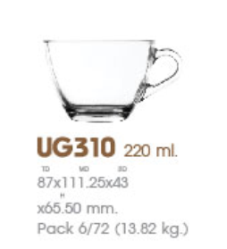 | UG 310 | Ø: 8.8cm - ØĐáy: 4.4cm - 220ml - Cao: 6.6cm - 6 lố/Thùng - 6 c/Hộp - 13Gr. |