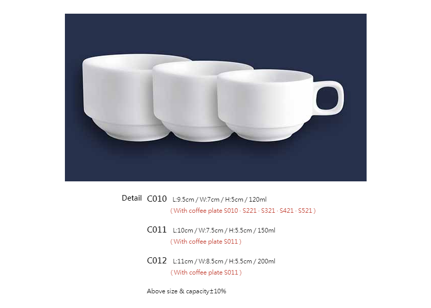 - 150ml - Dài: 10cm - Rộng: 7.5cm - Cao: 5.5cm - Tách C011 có thể dùng với dĩa lót tách