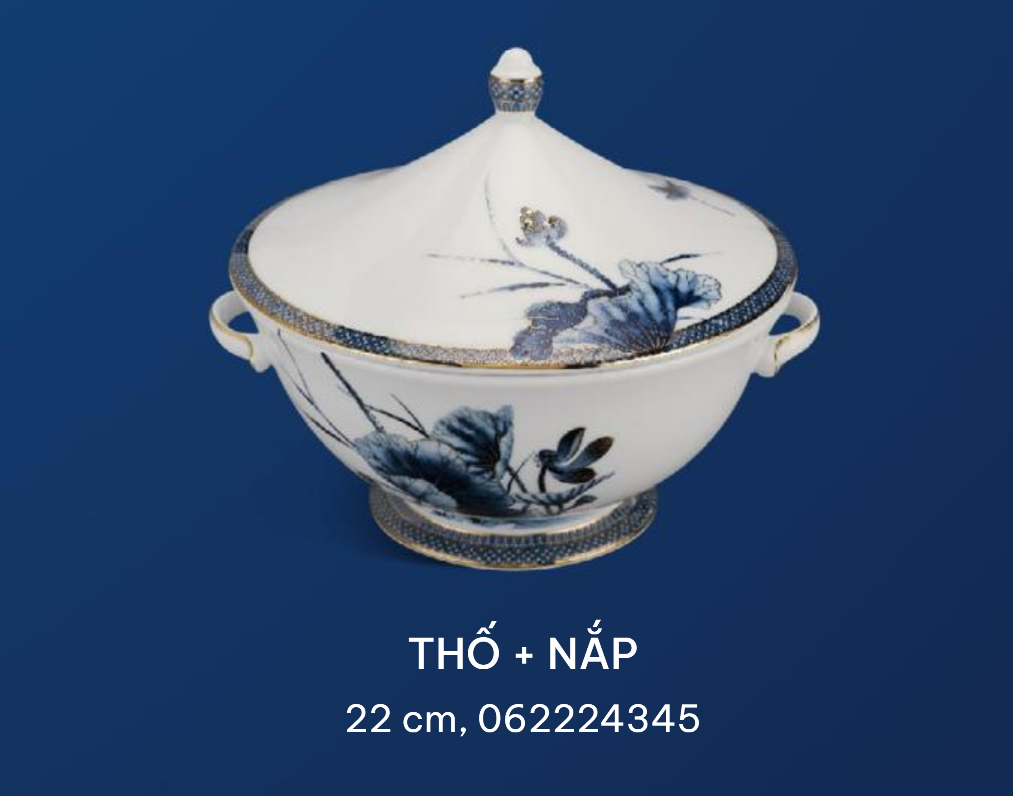Khoác lên vẻ truyền thống, nền nã của loài hoa Á Đông nhưng lại không kém phần tinh tế hiện đại, những cánh sen bung tròn, phúc hậu ôm lấy nhụy đã được tái hiện sống động bằng màu xanh cobalt đặc trưng của cung đình Huế. Bức tranh chân thực và sống động về lá, cỏ và hoa sen như đưa người ngắm về với một làng quê Việt Nam vốn yên bình, trù phú…