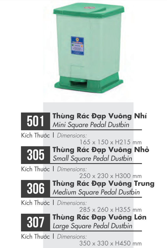 - Thùng Rác Đạp Vuông Nhỏ (305): 250 x 230 x H 300 mm