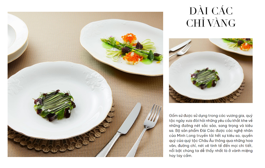Bộ sản phẩm Đài các toát lên vẻ đẹp kiêu sa, lộng lẫy theo phong cách quyền quý hoàng gia. Bộ sản phẩm có kiểu dáng sang trọng, nhiều đường nét được cách điệu, uốn lượn với dáng điệu mềm mại, mảnh mai. Cái tài của các nghệ nhân là đã khéo léo viền chỉ vàng ở những điểm nổi bật như vành chén, vành đĩa, tay cầm và nắp bình trà, trong đó nổi bật là núm sen vàng sang trọng. Hoa văn được nhấn nhá bằng những đường viền óng ánh vô cùng đẹp mắt, , càng tôn lên vẻ đẹp đẳng cấp của không gian ẩm thực cũng như phong cách thẩm mỹ của chủ sở hữu.