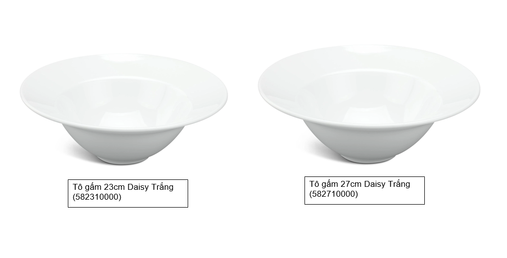 Daisy trắng có thiết kế đơn giản, không cầu kỳ nhưng vẫn giữ được nét sang trọng và thanh lịch hiếm thấy ở những sản phẩm khác. Mỗi chiếc đĩa, tô, chén… đều được tạo hình cân đối, tròn đều, không một vết trầy xước. Sản phẩm được nung ở nhiệt độ cao theo công nghệ của Đức, không chì, camidium, an toàn tuyệt đối cho người sử dụng.