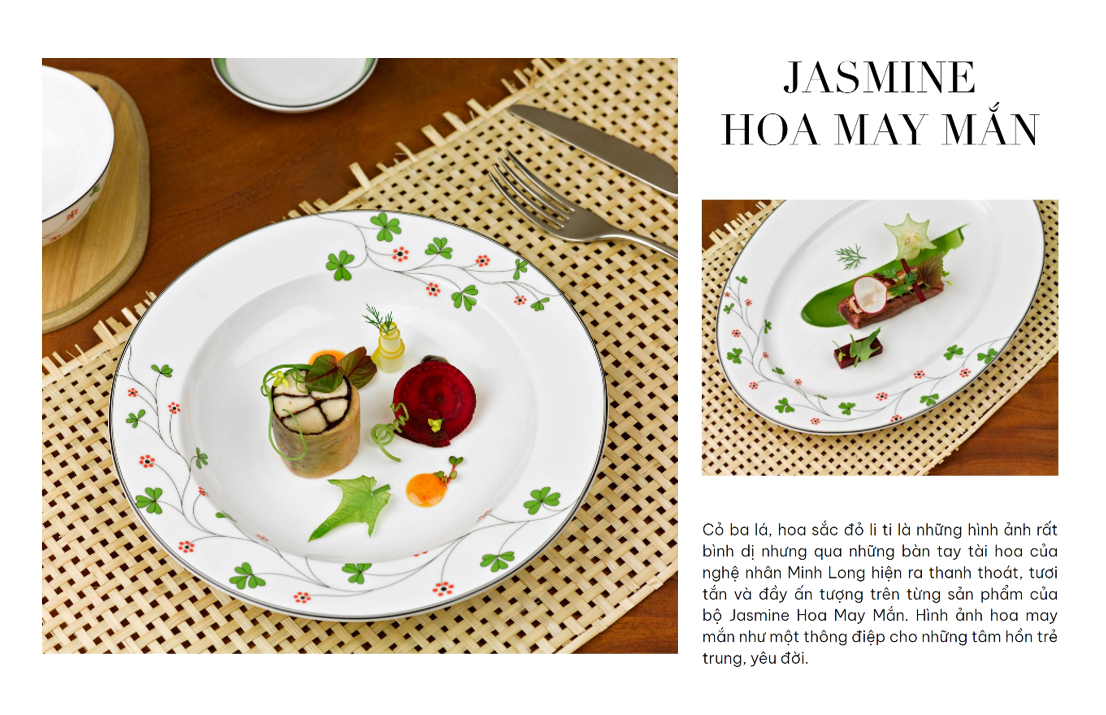 Những lá cỏ ba lá, hoa đỏ li ti rất bình dị nhưng qua những bàn tay tài hoa của nghệ nhân Minh Long hiện ra thanh thoát, tươi tắn và đầy ấn tượng. Màu sắc hài hoà với từng nét vẽ nhỏ xinh trên nền sứ trắng, thể hiện độ tinh xảo của sản phẩm cũng như sự chăm chút tỉ mỉ của nhà sản xuất. Bộ hoa văn Hoa may mắn như một sản phẩm đặc biệt dành cho những tâm hồn trẻ trung, yêu đời. Bộ bàn ăn với các sản phẩm đa dạng phù hợp với nhiều gia đình, thêm nhiều lựa chọn cho khách hàng, như: bộ bàn ăn, bộ trà... Bộ sản phẩm cũng là quà tặng thiết thực và ý nghĩa dành cho những người thân yêu.