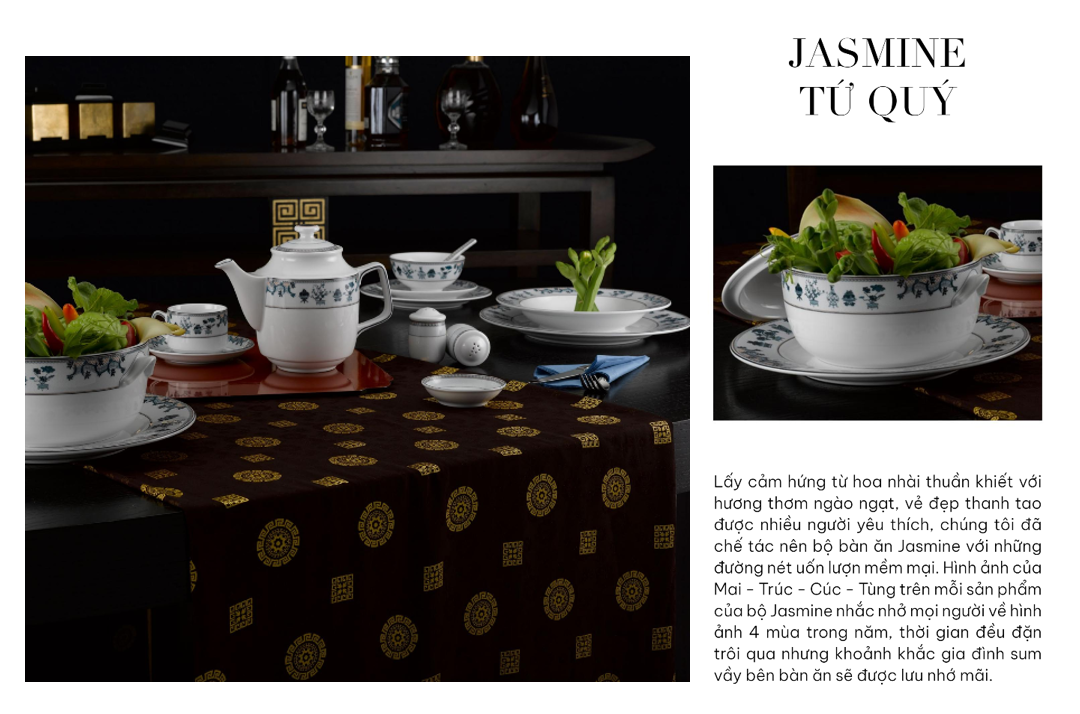 Bộ sản phẩm Tứ quý quy tụ 4 loài cây đại diện cho 4 mùa: Mai (mùa xuân), Trúc (mùa hạ), Cúc (mùa Thu), Tùng (mùa Đông), mang đến cho chủ sở hữu sự phú quý, sung túc và may mắn. Trên mỗi sản phẩm, 4 loài cây được khắc họa xen kẽ một cách khéo léo tạo nên một bộ tứ vừa vững chãi vừa mảnh mai. Đồng thời, sắc xanh hòa cùng men sứ trắng ngà tạo nên bức tranh thiên nhiên nhiều sắc màu với bao lời chúc tốt lành.