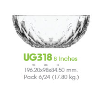 | UG 318 | Ø: 19.8cm - ØĐáy: 8.5cm - 1,600ml - Cao: 8.5cm - 2 lố/Thùng - 6 c/Hộp - 18Gr. |