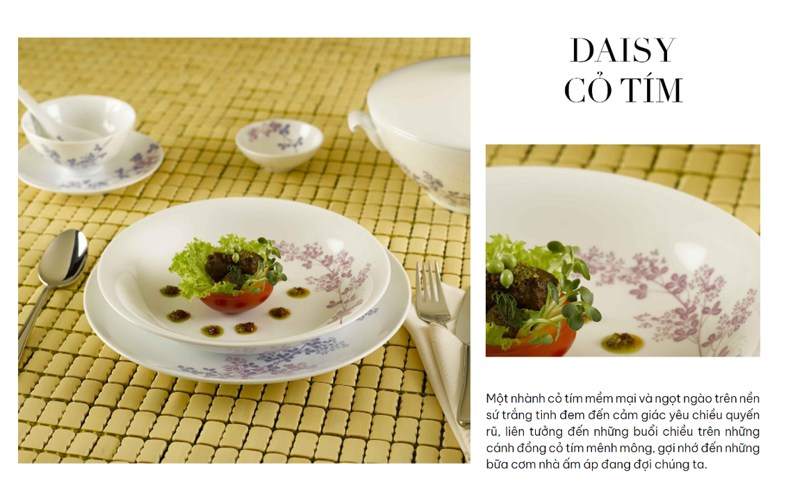 Daisy cỏ tím là bộ sản phẩm kết hợp giữa phong cách cổ điển và hiện đại. Những nhành cỏ tím uốn lượn mềm mại trên nền men sứ sáng bóng tạo nên sự thanh thoát nhưng không kém phần sang trong trong từng bình trà, tách, tô, chén chấm… Màu tím còn tượng trưng cho sự thủy chung, gợi nhắc người thương luôn quý trọng hạnh phúc gia đình.