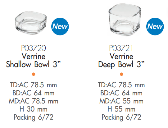 Bộ tô Verrine thích hợp để để phục vụ nhiều loại thực phẩm khác nhau, ví dụ như các món mặn hoặc ngọt nhỏ như bánh canape hoặc món khai vị.